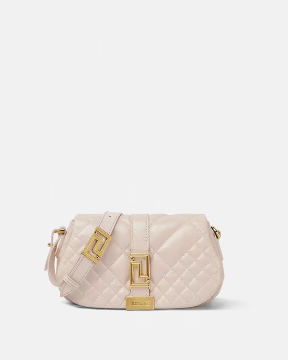The Greca Goddess line is characterized by the central Greca chain hardware. Crafted in Italy from quilted leather, it features a spacious interior with an additional slip compartment. A leather strap can be adjusted for shoulder or hand-carry options.
