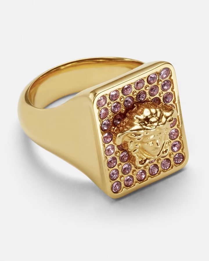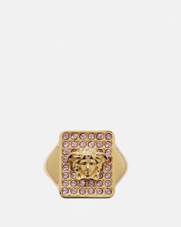 This ring from the Versace Tiles collection features a Medusa charm resting on a rectangular crystal-embellished tile. All Versace jewelry products are lead and nickel free. All materials are hypoallergenic.